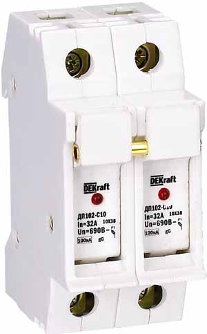 Держатель серии ДП-102 цилиндрического предохранителя ПЦ-102 DEKraft; 2P; для габарита С10 (10 x 38 мм); со светодиодной индикацией срабатывания; номинальный ток – до 32 А; ширина – 2 мод. х 18 мм; установка – на DIN- рейку; рабочее положение - любое, но предпочтительнее вертикальное; подключение питания - сверху или снизу; степень защиты – IP20. Предохранители применяются для защиты сетей от перегрузки и токов КЗ в сетях напряжением до 500 В.